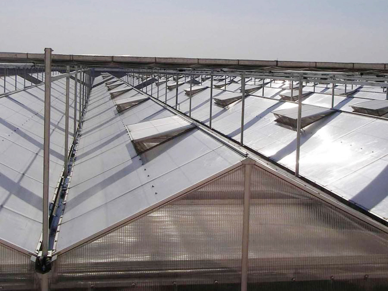 連續開窗系統,由若干排齒輪齒條,在驅動軸的帶動下,將溫室窗戶進行開啟。連續開窗適用于各種類型的溫室,可有效提高溫室通風面積,達到增加溫室通風降溫的效果。主要設備配件有減速電機、傳動軸、齒條、齒輪、軸承座等。扭距分配式開窗系統是連續式開窗的一種,由一臺減速電機驅動一系列扭距分配器,扭距分配器作用于連續開窗的驅動軸,實現開窗。交錯開窗系統又稱為推桿開窗系統,適用于Venlo型溫室。開窗時,齒輪齒條在驅動軸帶動下運動,推動推桿向前運動,在支撐臂的作用下,將窗戶打開。交錯式開窗僅適用于頂開窗系統。交錯式開窗因齒輪齒條機構不同而分為軌道式和擺臂式兩種形式。二者主要區別于,前者單根齒條推力大,可適用長度較大的溫室,后者適用于長度較小,但結構簡單,造價較低。系統組成:齒輪、齒條、推拉桿、減速電機、驅動軸、支撐臂等附件。